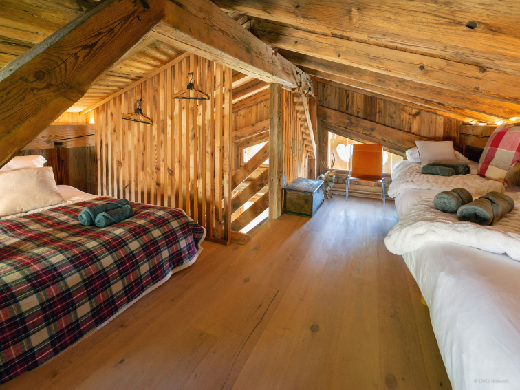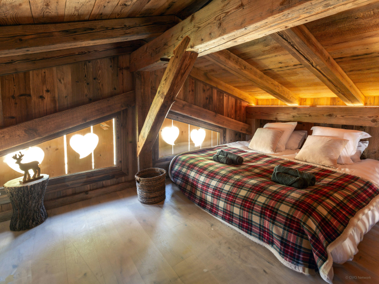 Une ravissante chambre a été aménagée sous la charpente, magnifiée par les poutres et les volets en forme de cœur. Elle propose un grand lit double et deux lits simples, ce qui en fait un cocon chaleureux pour des vacances en famille.